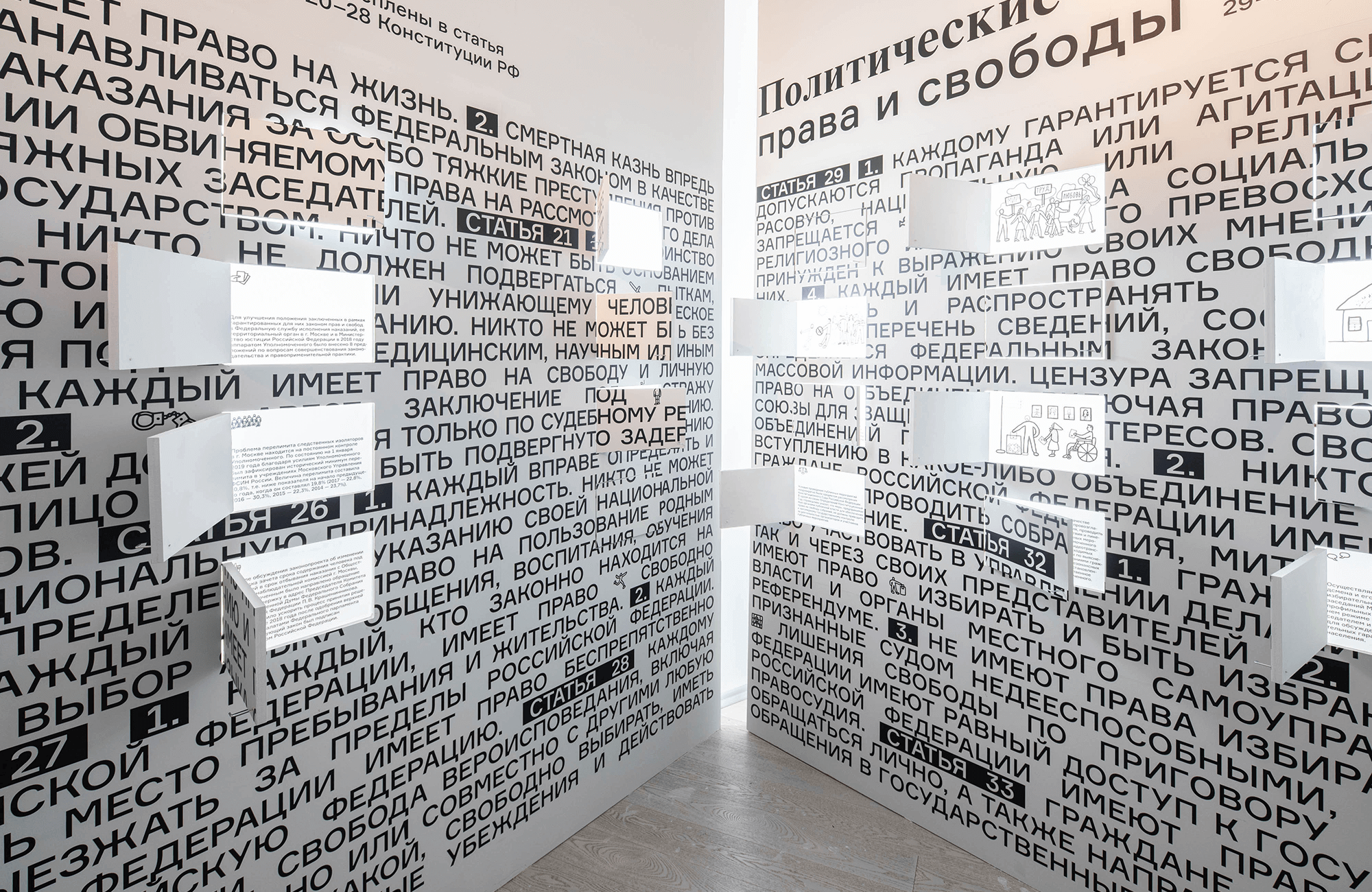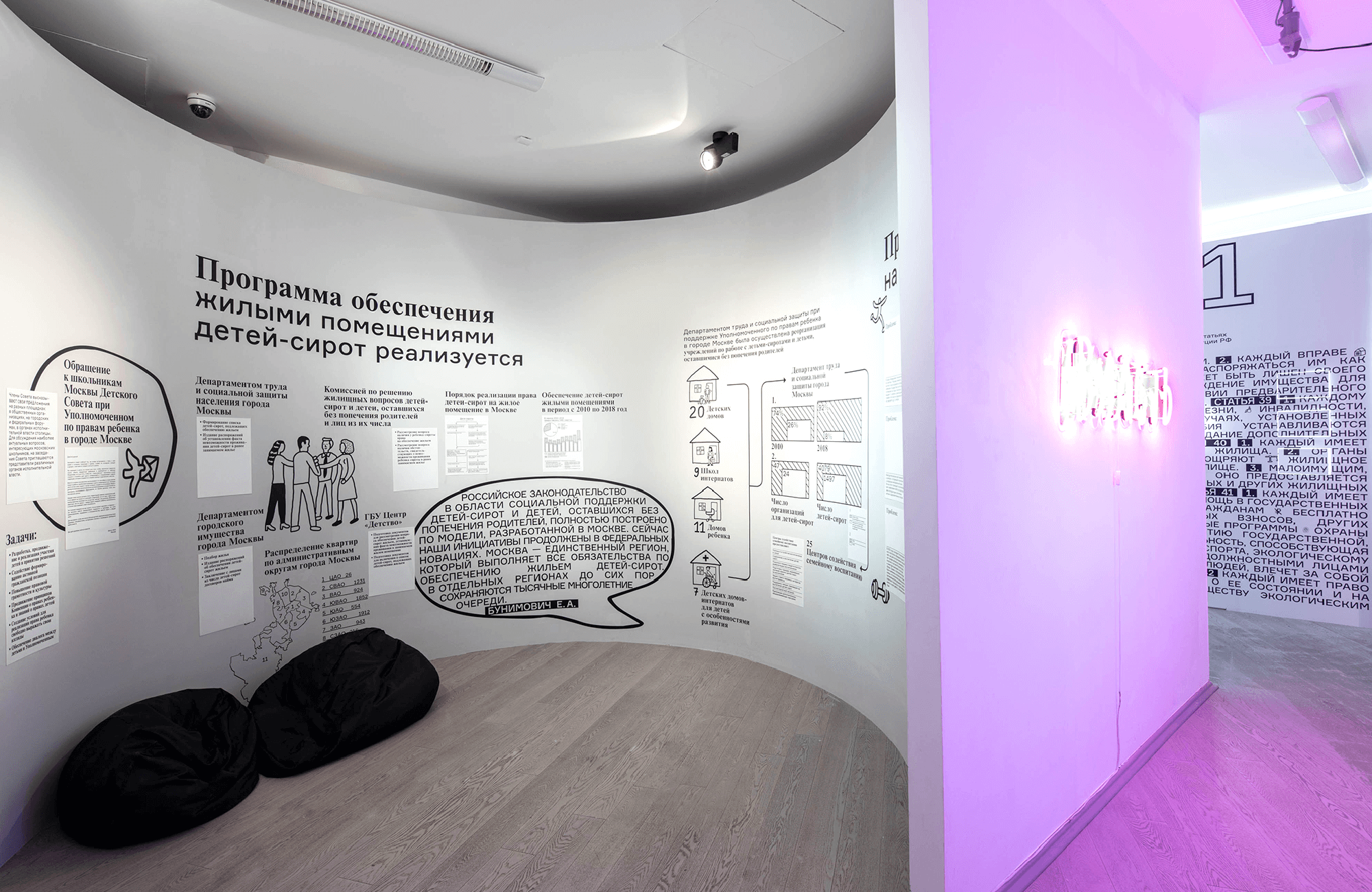 Exhibition design in celebration of the 10th Office of the Human Rights Comissioner anniversary in Moscow. This exhibition aimed to show the principles of the Ombudsman activities, the results of their work and explains where to seek help and how. This project was undertaken together with Novoe Bureau.